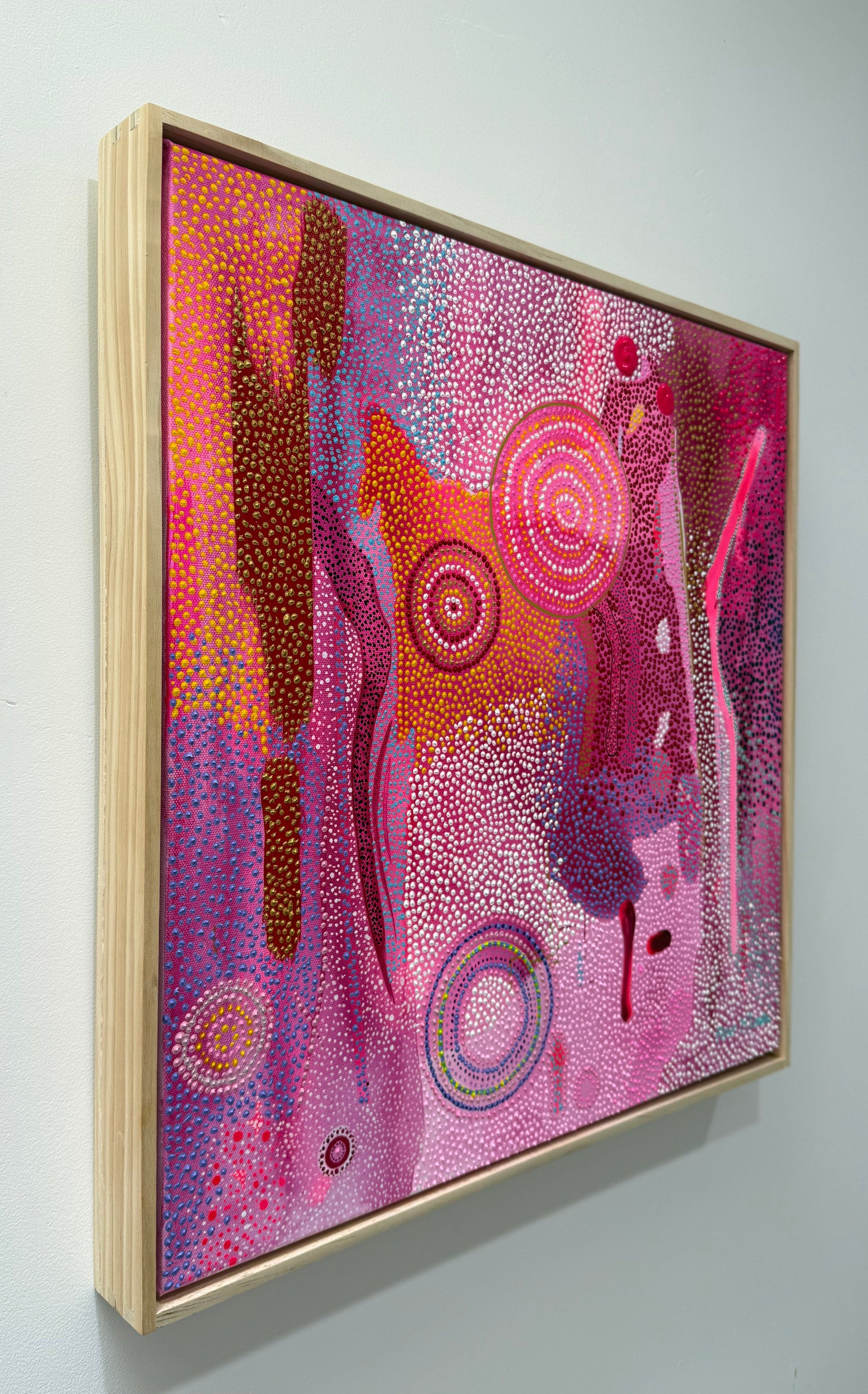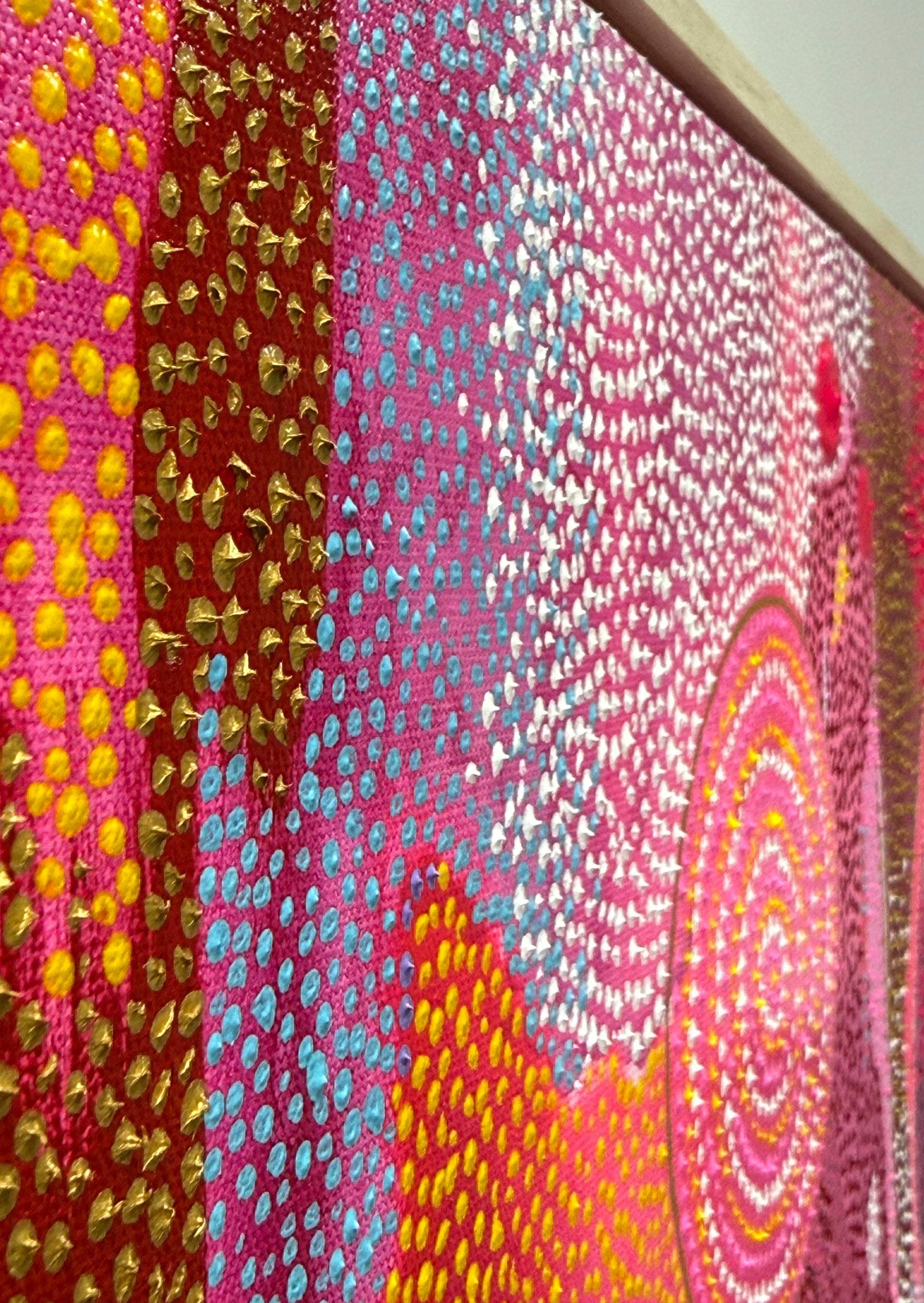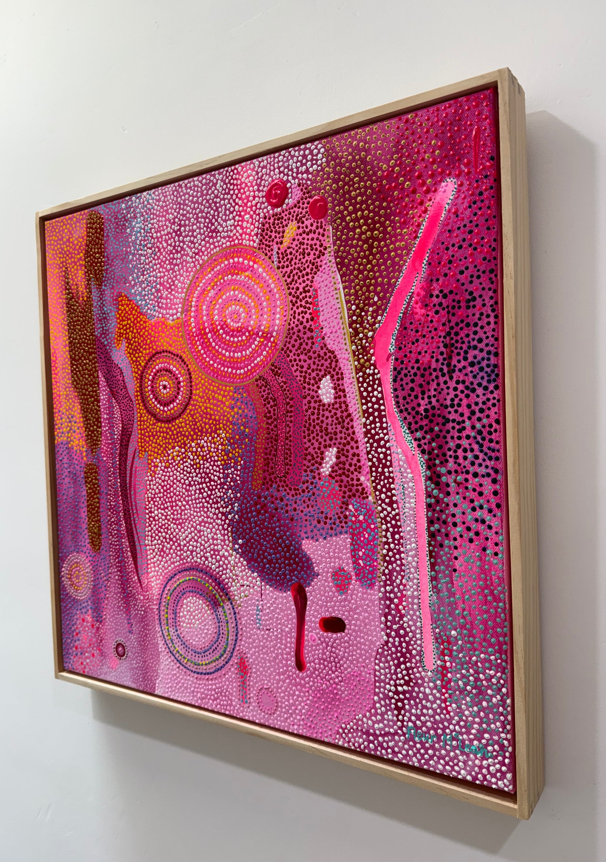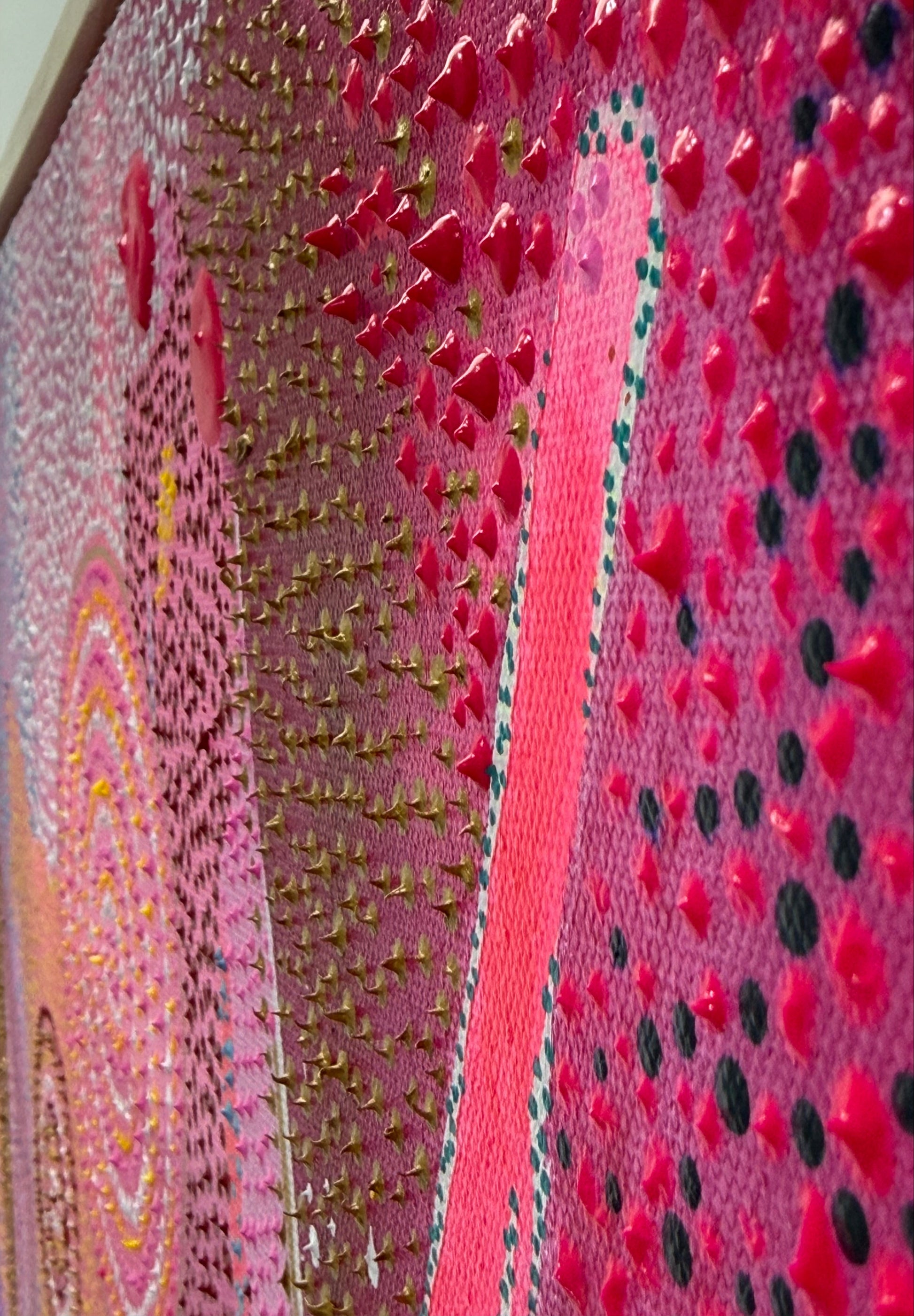 The work began with inks, allowing their natural movement to guide the composition. From there, the painting evolved through my detailed dot work, creating layers of rhythm, texture, and depth. Dominated by beautiful, rich pinks, magentas, soft purples, and gold, the palette radiates warmth.