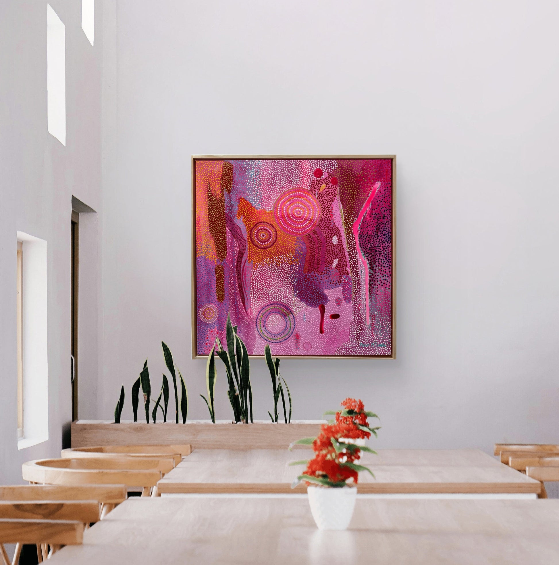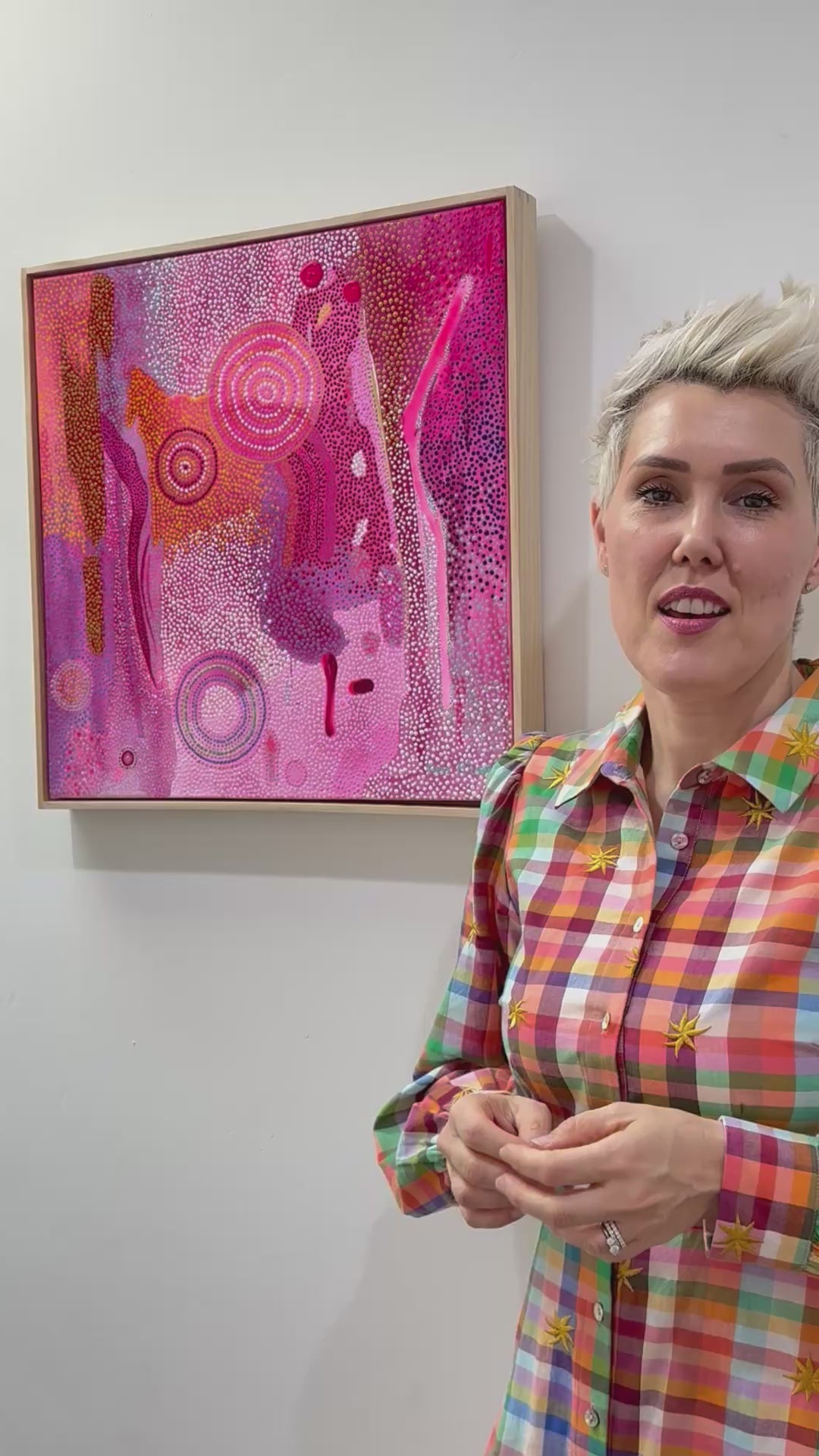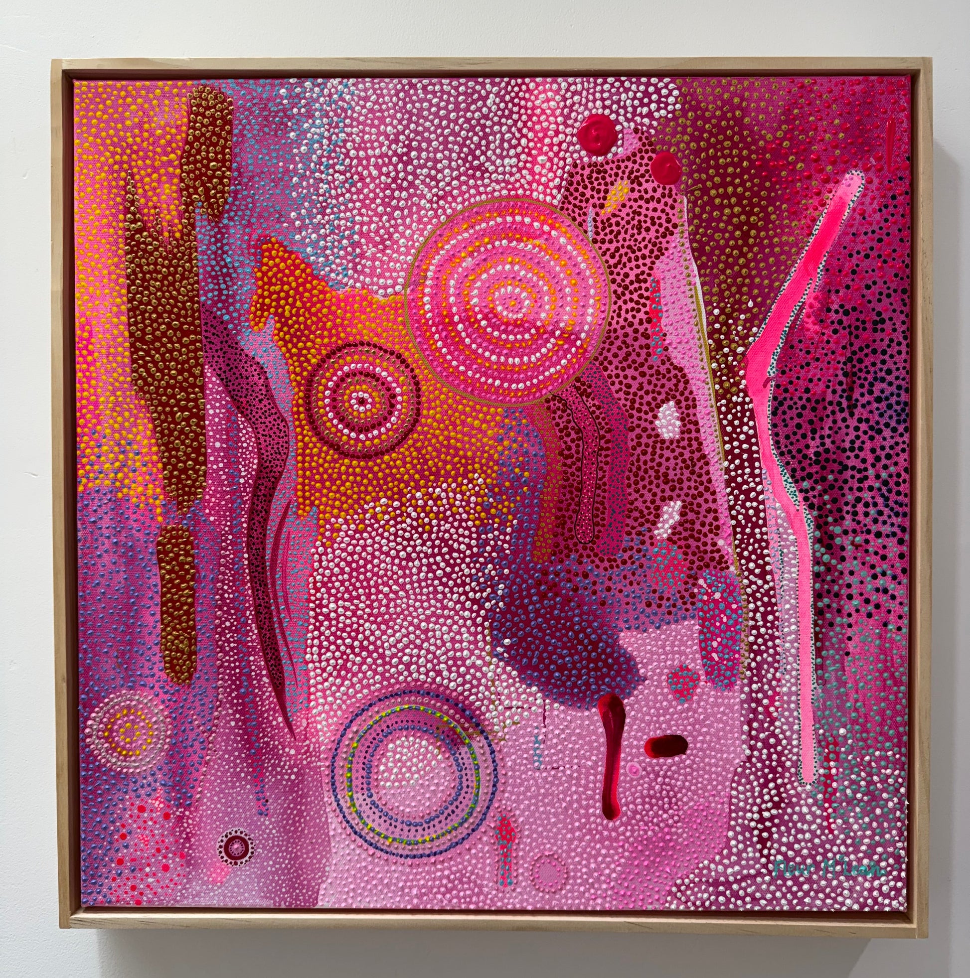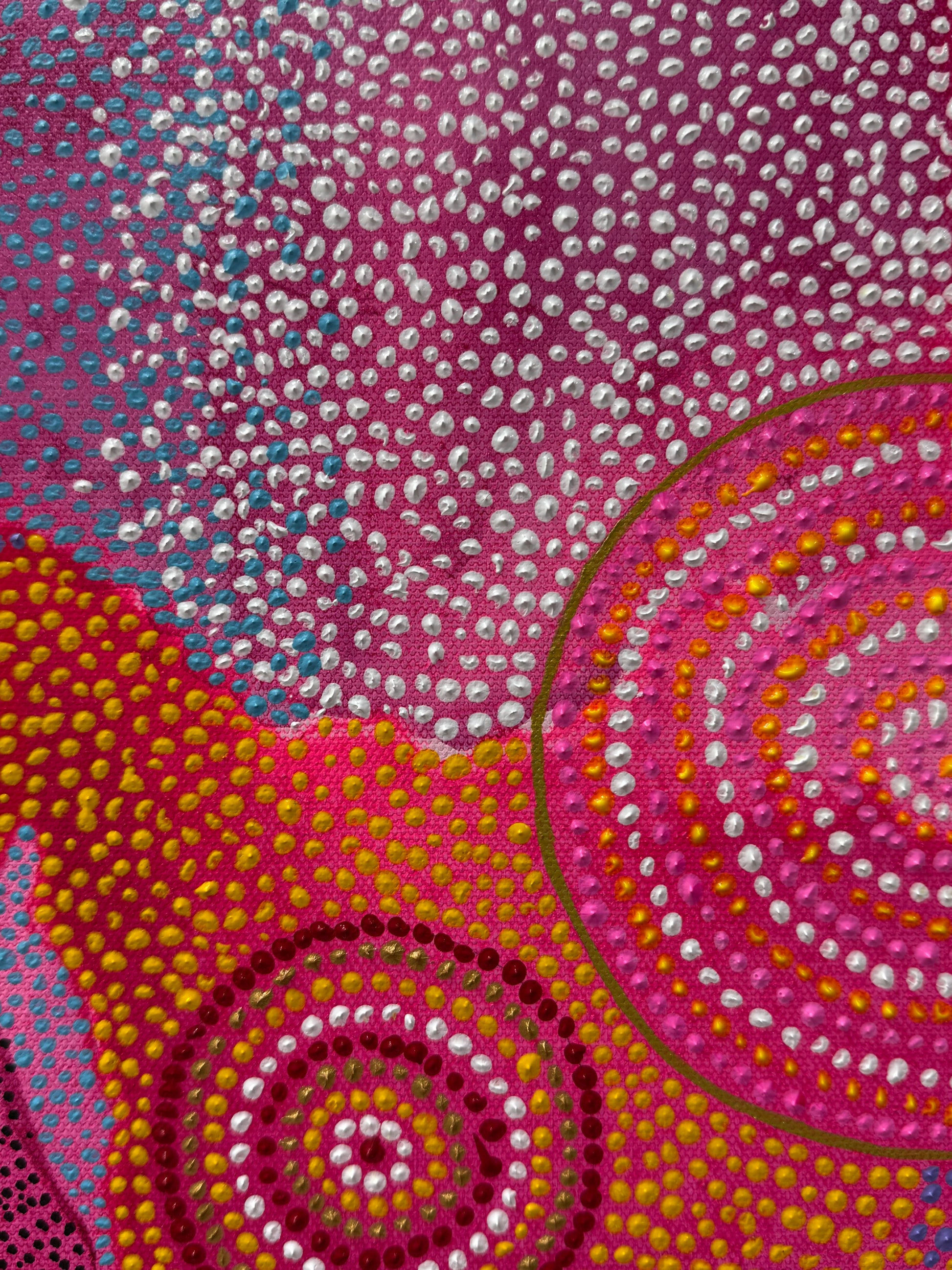 The work began with inks, allowing their natural movement to guide the composition. From there, the painting evolved through my detailed dot work, creating layers of rhythm, texture, and depth. Dominated by beautiful, rich pinks, magentas, soft purples, and gold, the palette radiates warmth.