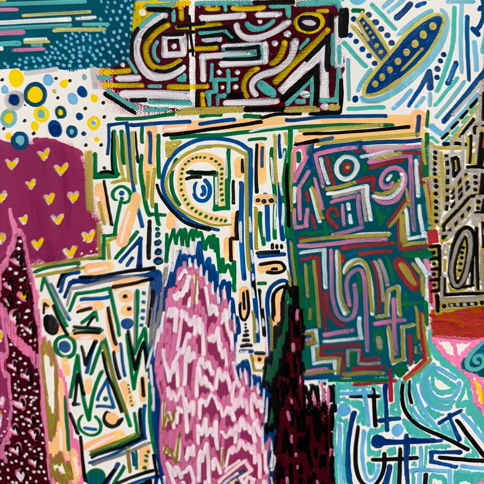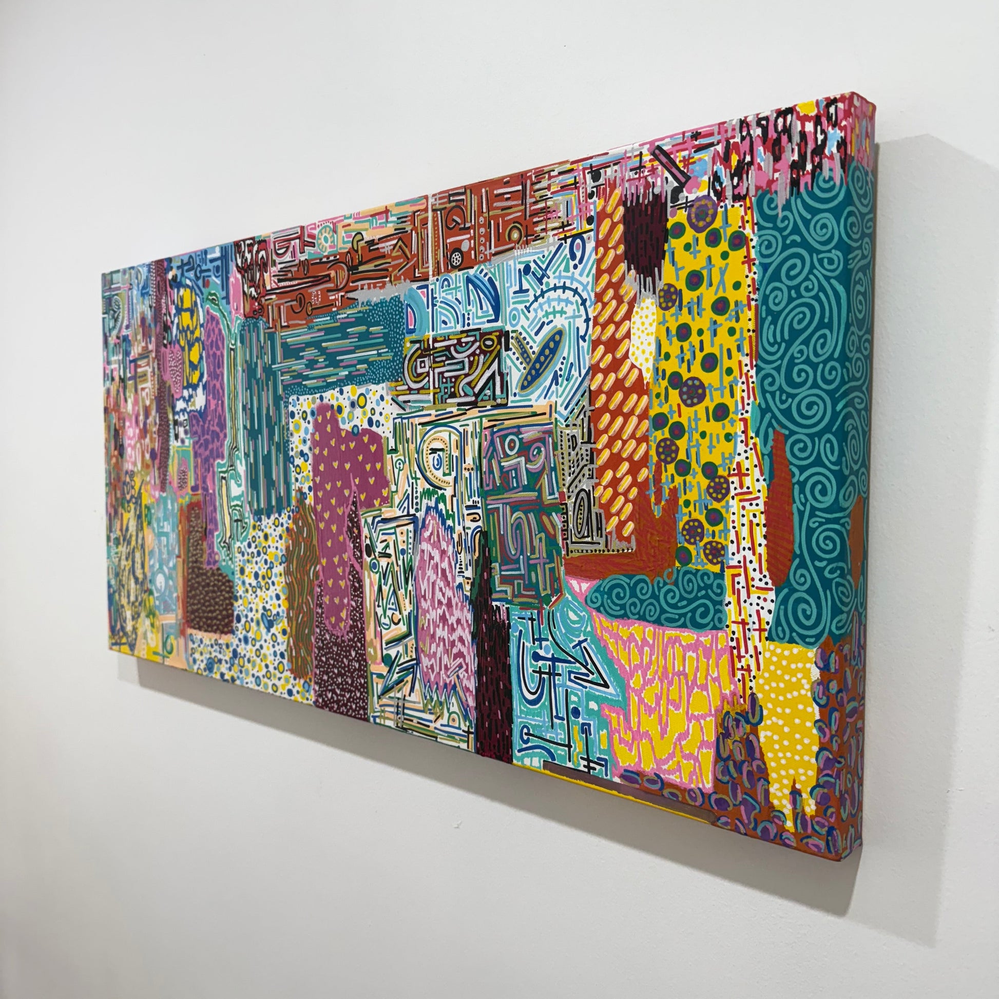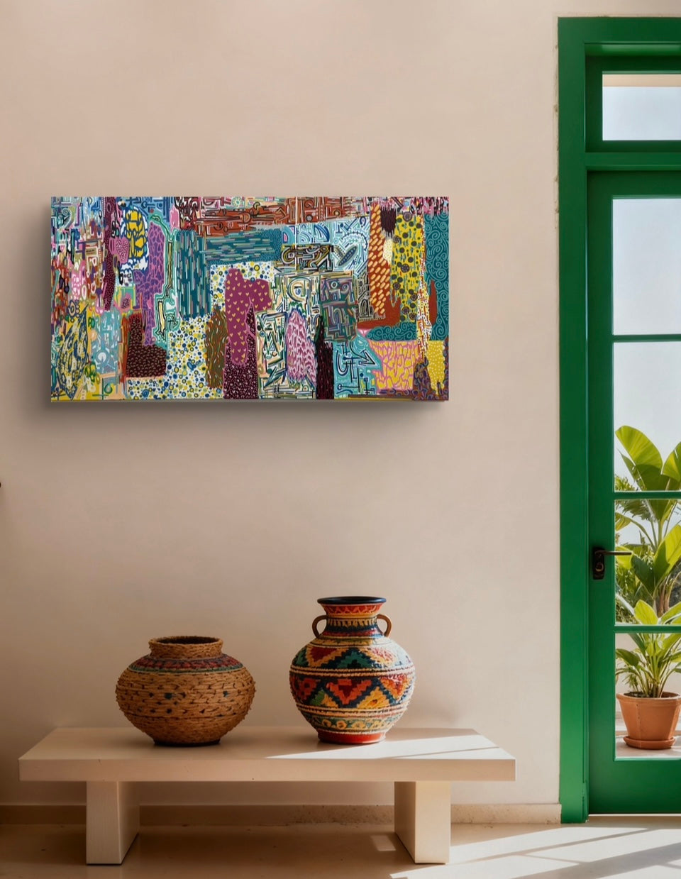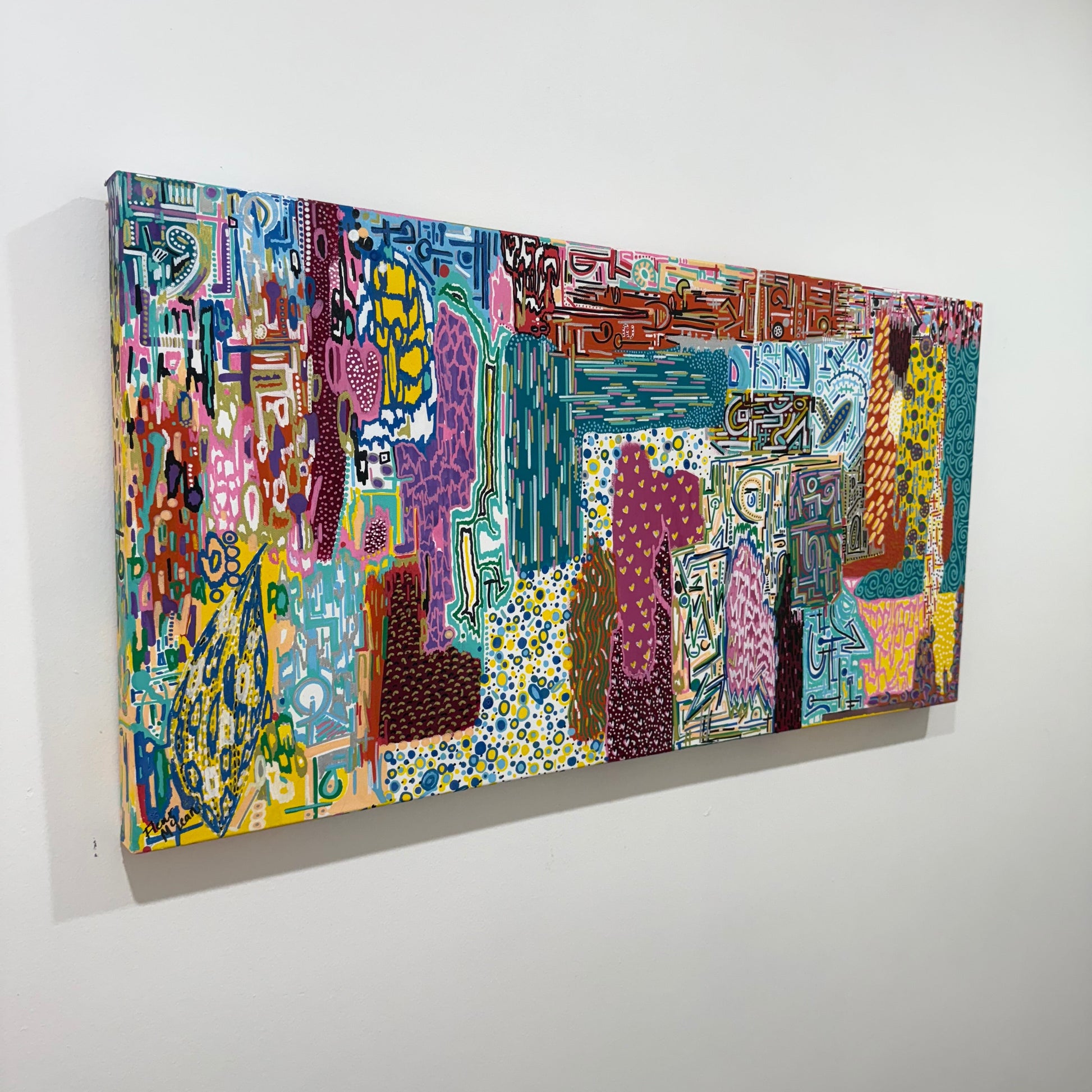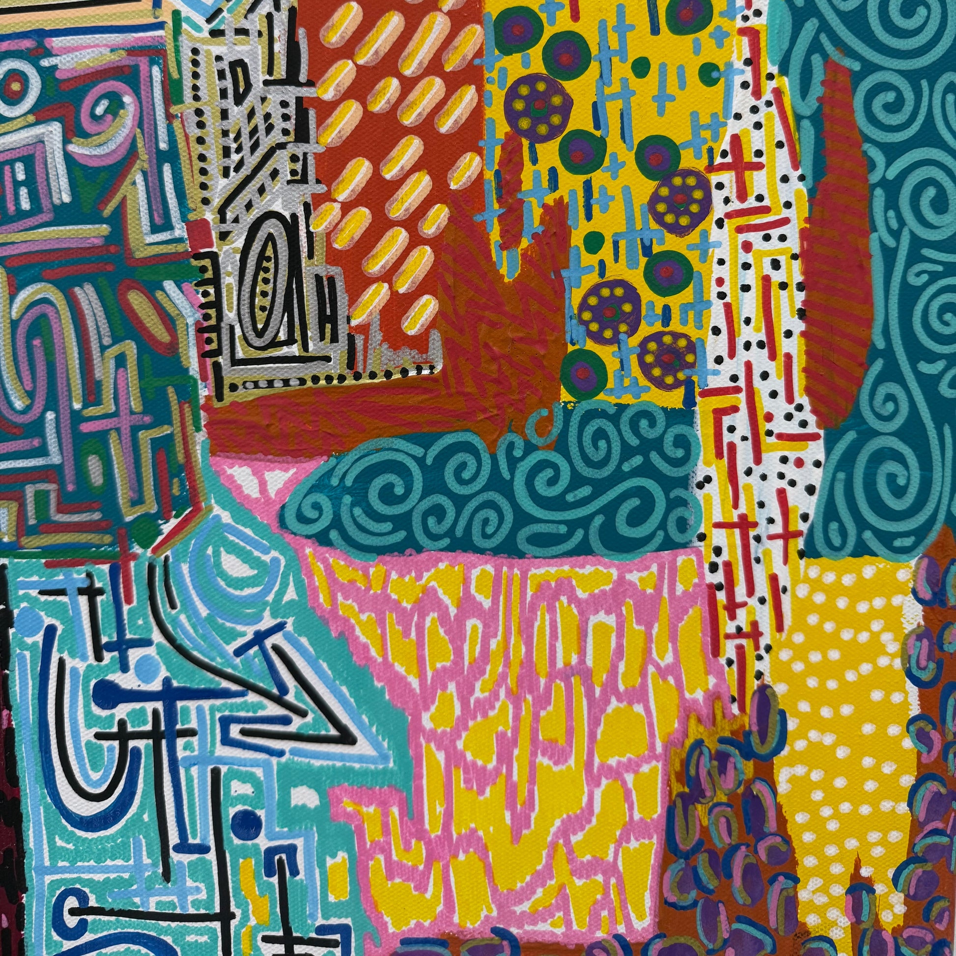 This vibrant abstract painting is a celebration of colour, created from a rich mix of layered patterns. Energetic lines, swirling shapes, and bold blocks of colour's come together, revealing many hidden pathways throughout the piece.
